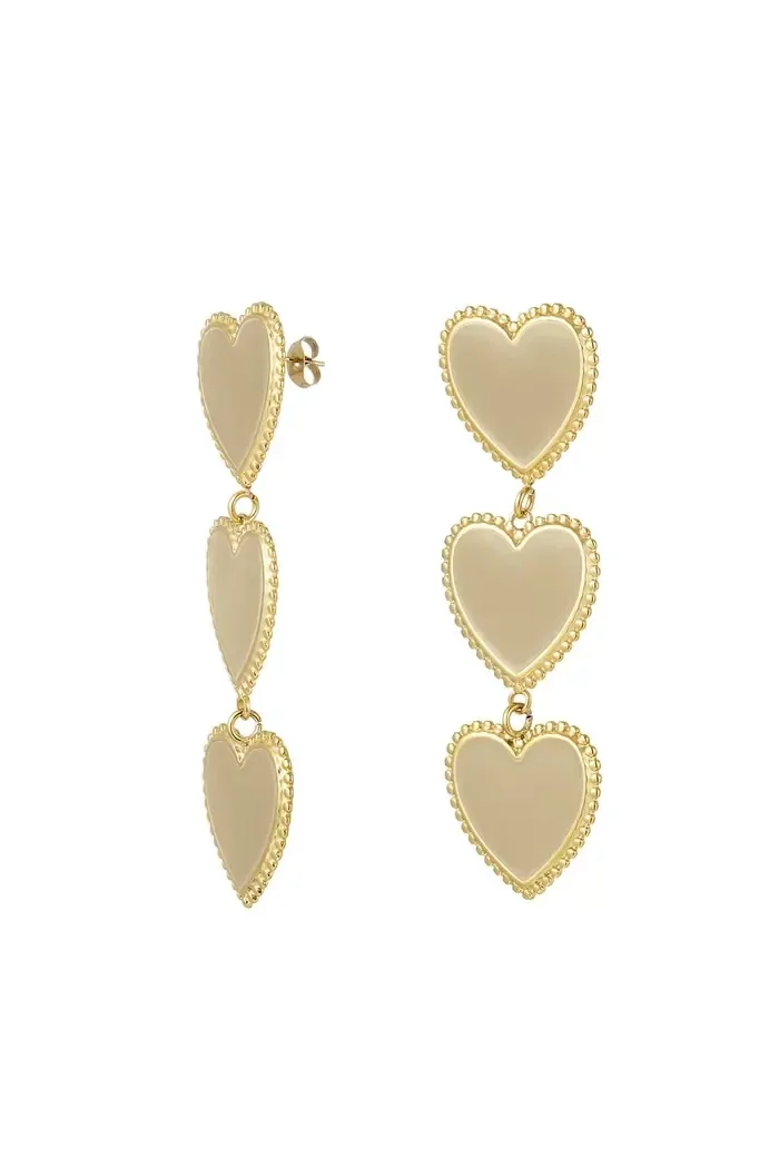 Hoe tof zijn deze gouden statement oorbellen met drie donkergroene sierlijke hartjes op een rij! De oorbellen zijn voorzien van een prachtig randje om de hartjes. Superleuk om jouw outfit af te stylen en deze oorbellen te combineren met meerdere paarse accessoires!