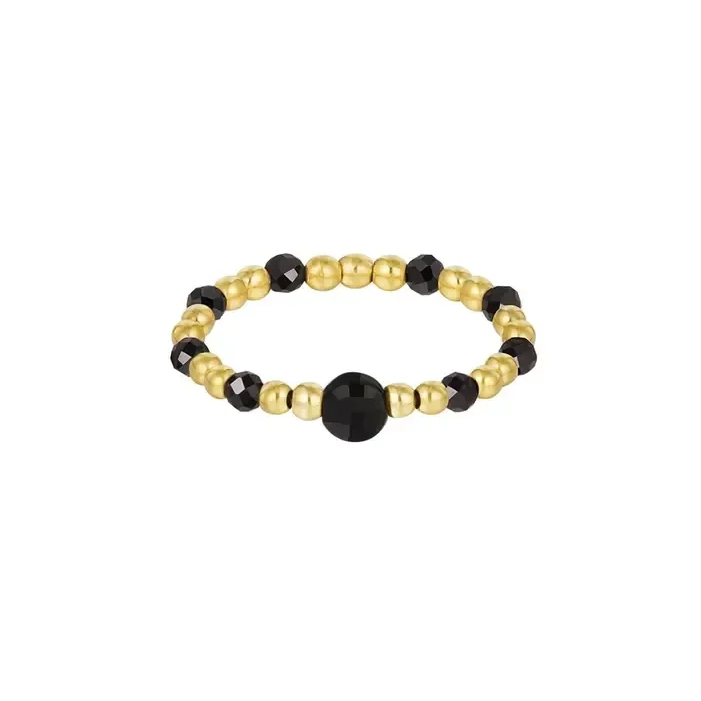 Een elastische gouden kralenring met zwarte details. De ring kun je perfect combineren met andere gouden ringen voor een leuke look! Ook leuk om deze ring met zwarte details te combineren met meerdere sieraden met zwarte details!