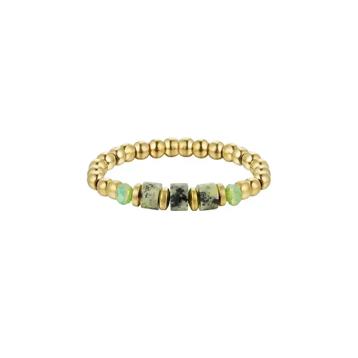 Hoe leuk is deze schattige kralen ring in de kleuren goud met groen! De ring is perfect te combineren met meerdere sieraden en is eenvoudig te verstellen dankzij het elastiek!