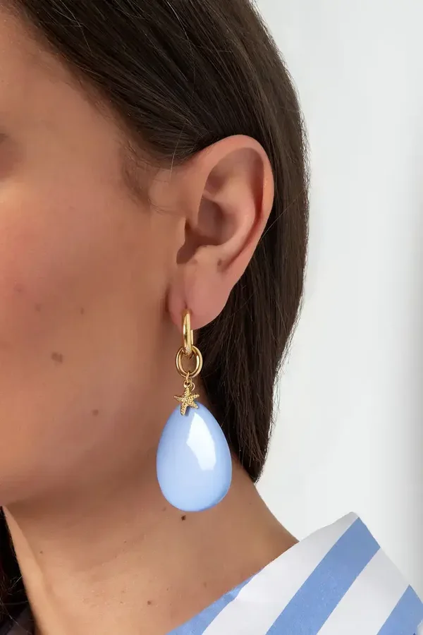 De oorbellen hebben een afmeting van 3 x 7 cm en zijn verkrijgbaar in blauw/goud en lila/goud.