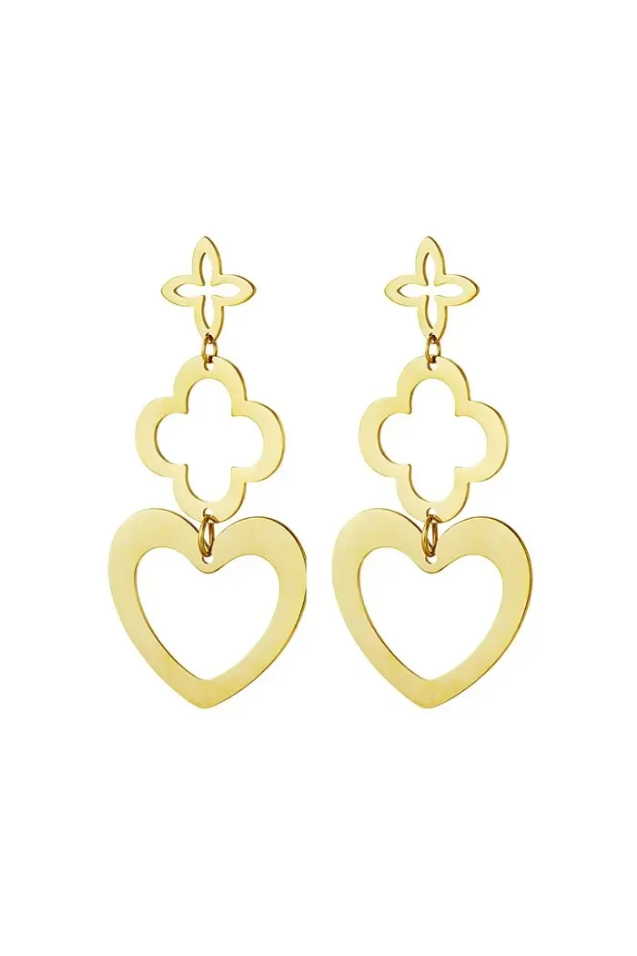 Hoe leuk zijn deze gouden statement oorbellen met drie prachtige bedels in de vorm van een hart, bloem en klaver. Dankzij deze prachtige oorbellen kun jij een perfecte look creëren. Je kunt deze oorbellen bijvoorbeeld perfect dragen naar een festival of een tof feestje. Leuk om deze oorbellen te combineren met meerdere sieraden met bedels.