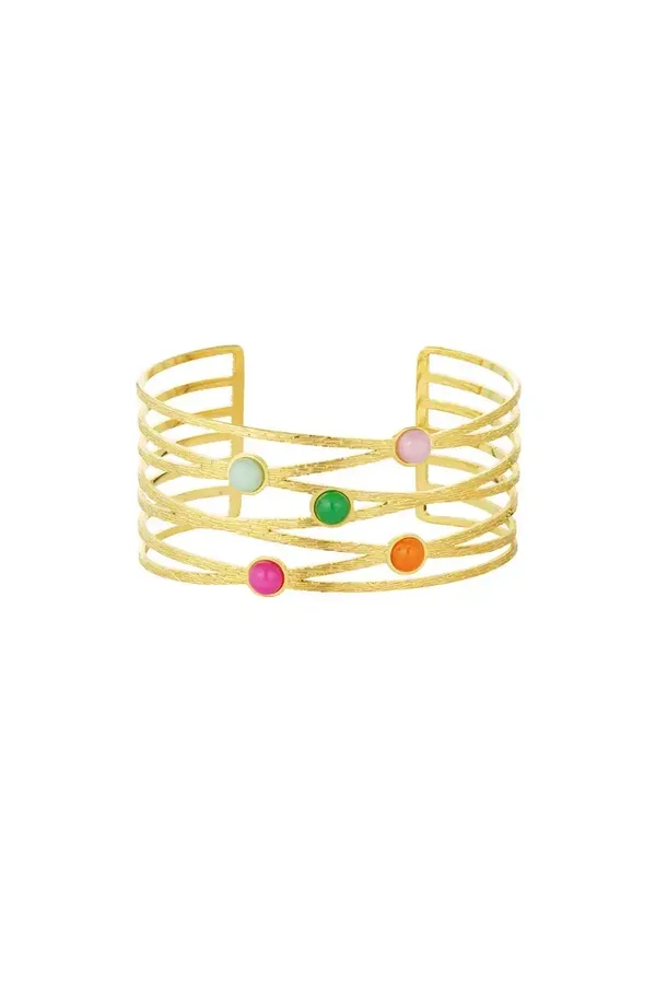 Ben jij op zoek naar een statement armband? De armband is voorzien van vijf prachtige stenen en heeft een feestelijke uitstraling. Je kunt deze armband perfect enkel dragen maar ook zeer leuk te stylen met meerdere armbandjes!