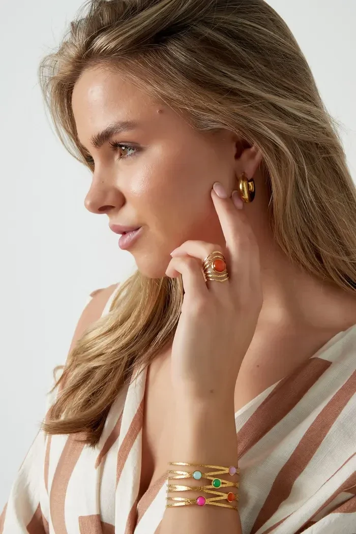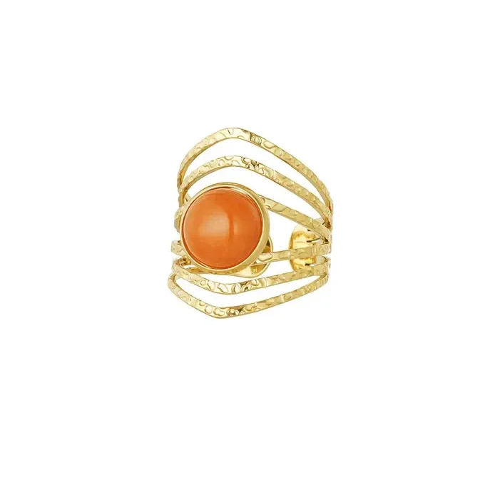Shop nu deze prachtige gouden ring met laagjes en een grote oranje steen in het midden! De perfecte ring om enkel te dragen of juist te combineren met meerdere trendy ringen.
