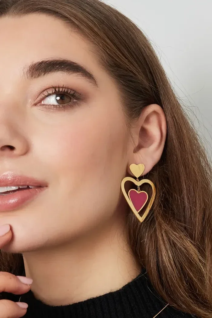 Hoe mega leuk zijn deze gouden oorbellen met dubbel hartje. De oorbellen zijn voorzien van een goud hartje en een roze hartje. Te leuk om deze oorbellen te combineren met meerdere sieraden met gekleurde details.