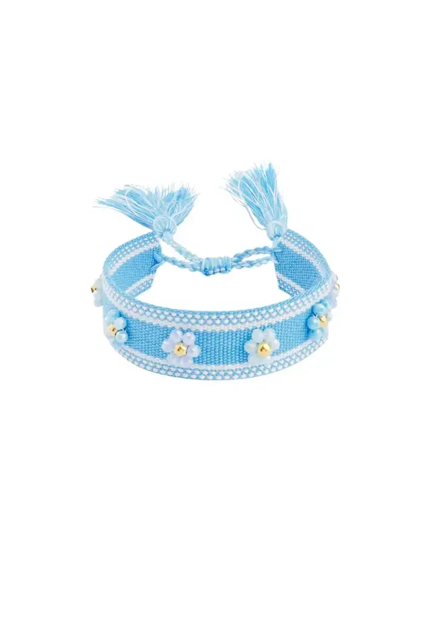 De armband is gemaakt van polyester, glaskralen en stainless steel en kan je strakker maken door aan de touwtjes te trekken dus past hij om elke pols.