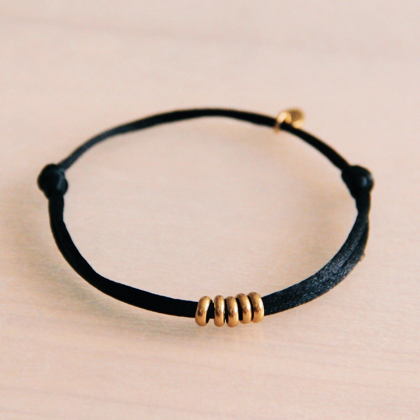 Het armbandje is gemaakt van zwart satijndraad en is voorzien van 5 RVS ringen. Het armbandje is verstelbaar door middel van twee schuifknoopjes.