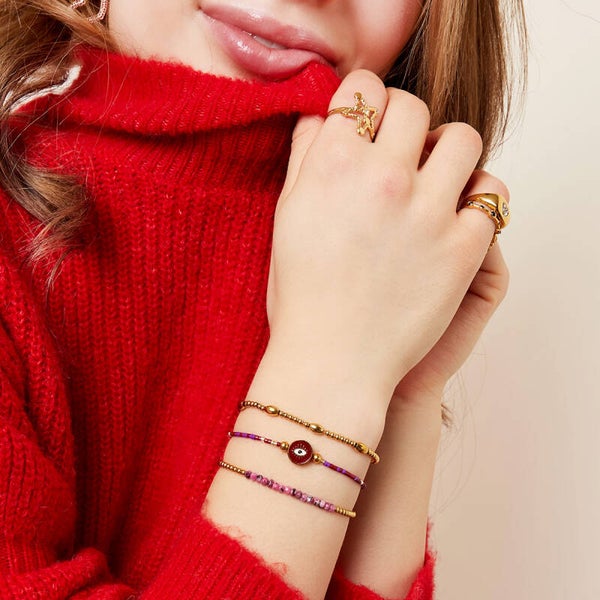 Kralenarmband met roestvrijstalen hanger in oogdesign geregen op elastiek.